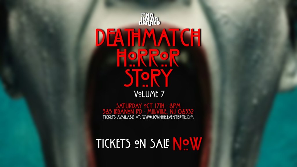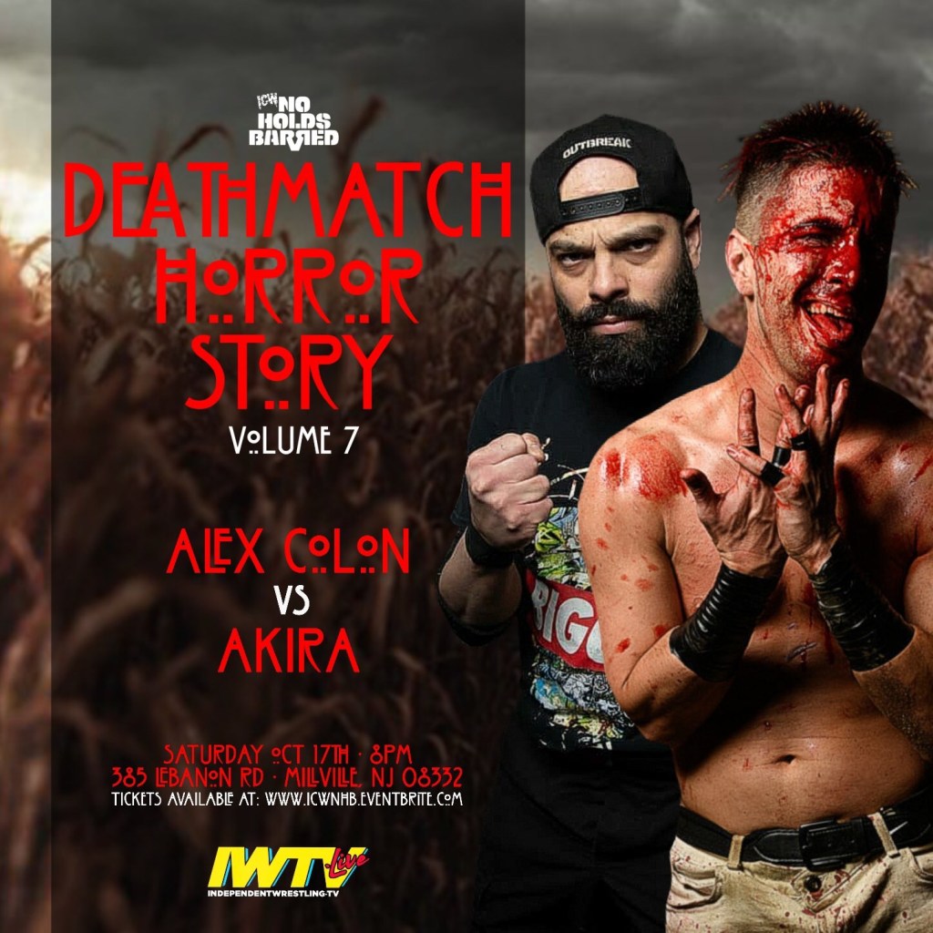 While it looks like the warm summer weather is looking to retire for the season, ICW No Holds Barred plans to continue “rolling with the punches” all the way into December. They’ll be stopping into Florida in November and Indiana in December, keeping this strong freight train of momentum going. However, closer on the horizon for the company is Volume 7: Deathmatch Horror Story. The even, going down in Millville, NJ features a bout where we will see American Deathmatch staple, Alex Colon take on one of the rising stars in both ICW and the Deathmatch genre, AKIRA.