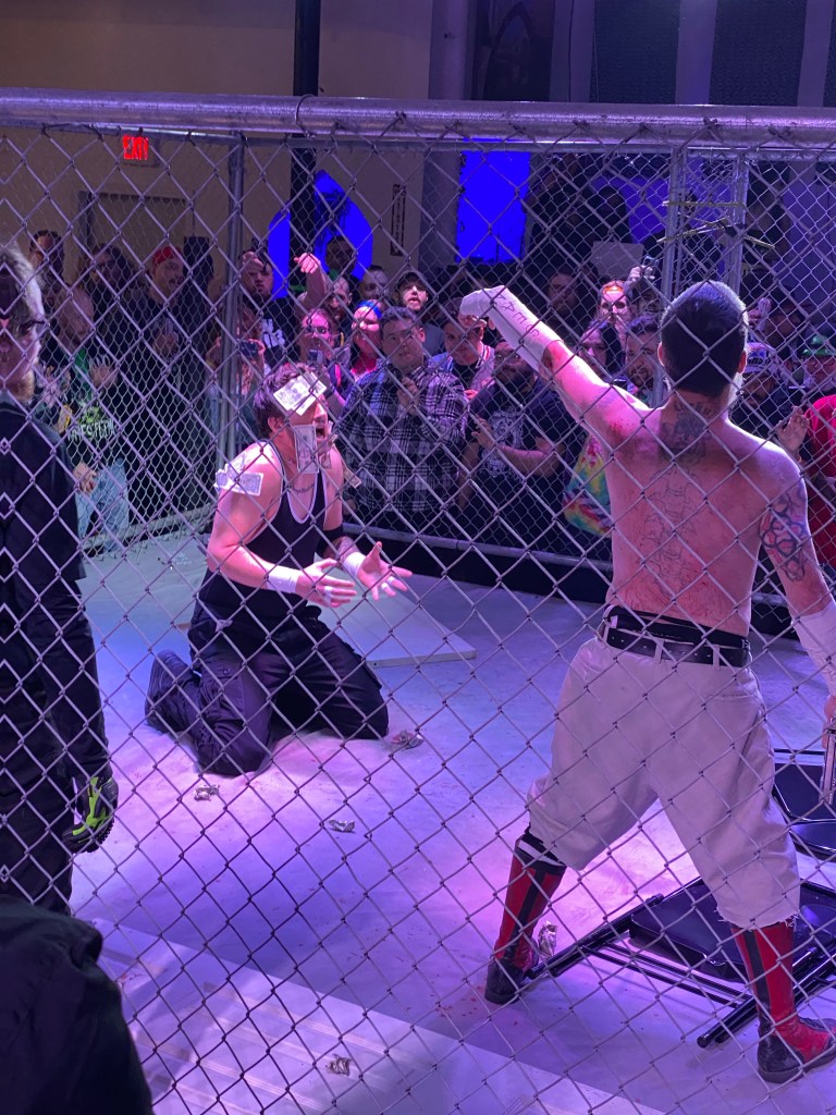 When Cas and HoodFoot come together, they can do no wrong, and here we test that sentiment again. The two preceded this Hoss Fight with a couple of beers before trading blows like a 2000s Kimbo Slice tape. The tide shifted towards HoodFoot with some bat and chair based offense and a well placed Cutter on an open chair. Cas then took charge with some skewers to the head and a big man Overhead Belly-to-Belly through a door. Out came Satan Cock 4 as Cas would put HoodFoot in a Modified Muta Lock and Crossface with the spiked dildo firmly across Mo’s face. And in a first that I’ve ever seen live, HoodFoot regained control and introduced a couple of Candles; pouring the wax onto Cas’ flesh and making the room smell great! HoodFoot would send Cas home with a Northern Lariat for the win in this Hoss Fight. Post-fight, both men would share an emotional moment as they sat on the mat shared a hug “one time for the working man.” Yet another entertaining chapter in the ongoing matchups between Casanova and HoodFoot. With a ring, without a ring or without ropes, Cas and HoodFoot continue to have a series of great matches. Looking forward to the next time they get to lock up.