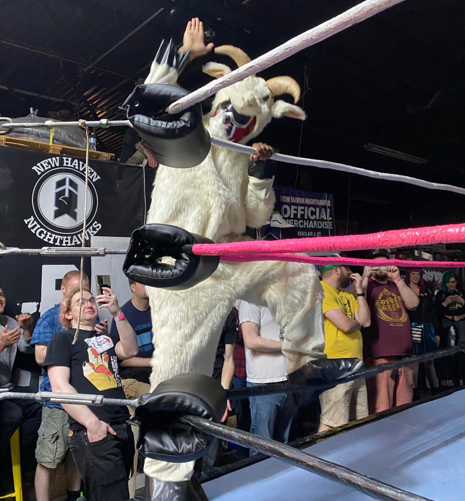 We follow up two big men wrestling each other with two big men teaming together against your mom and a stuffed goat. Bobby Orlando would take the upper hand on Dad Bod Squad in the opening moments. Though it was only a matter of time until Dad Bod Squad called in the goat. Once Bobby Jr. was brutalized in the ring and thrown from the match, it quickly devolved into a two-on-one shakedown.