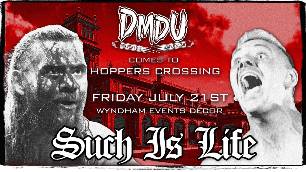 After a couple of months of inactivity, Deathmatch Downunder has announced their return event. On July 21st, Deathmatch Downunder will present Such is Life, live from Wyndham Events Decor in Hoppers Crossing, Victoria, Australia. Announced thus far are three big time matchups, starting with Edward Dusk facing Tyson Baxter in a Steel Cage Match over twelve months in the making. On the Deathmatch end of the card, “The Smash Hit” Joel Bateman will face Kid Valiant in a Deathmatch. And Vixsin will defend her DMDU World Deathmatch Championship against Michael Weaver in a Blazing Saddles Deathmatch. Tickets for Such is Life are available now and you can follow Deathmatch Downunder on Twitter for updates.