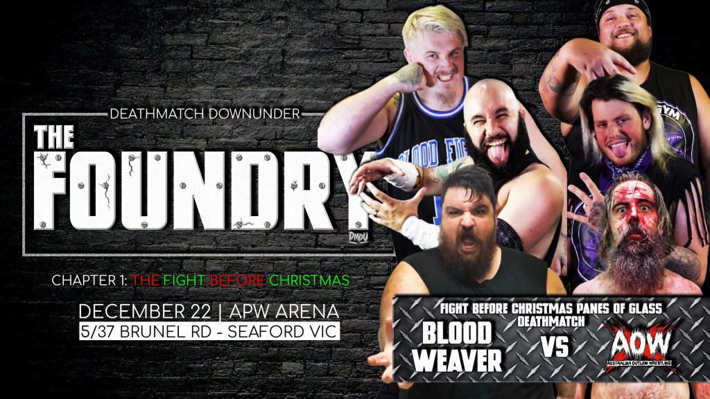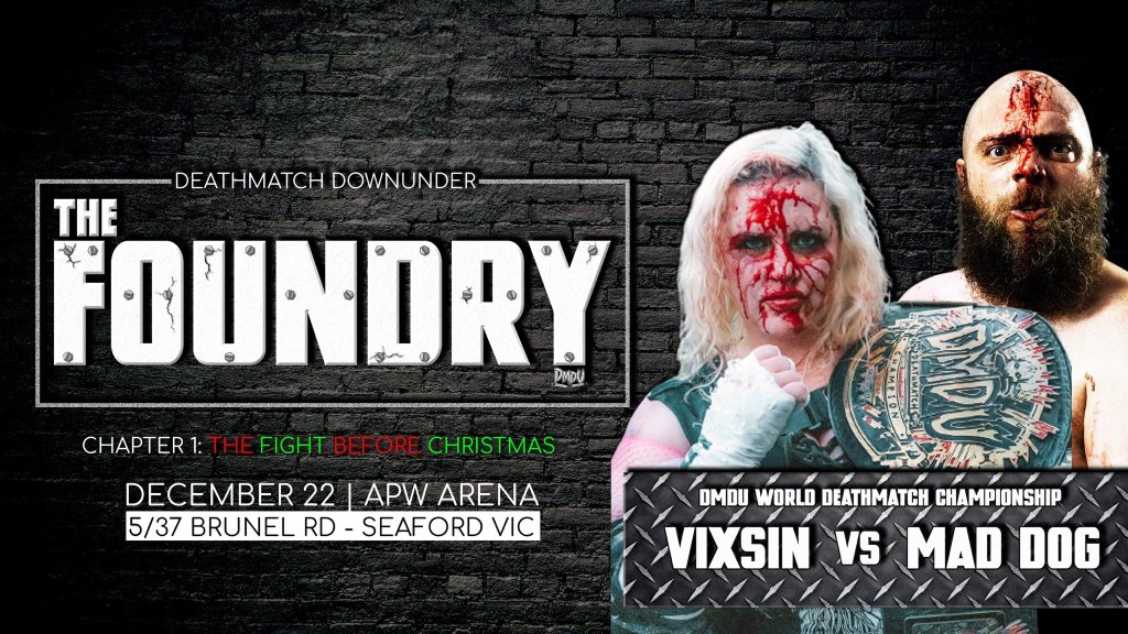 On December 22nd, Deathmatch Downunder adds an extra shade of red to the holiday season as the company is set to present The Foundry Chapter 1: The Fight Before Christmas. It has been confirmed that there will be two Deathmatches to ring in the holiday cheer at The Foundry. Firstly, what was originally set to be a Tag Team Barbed Wire Boards Deathmatch has grown much bigger. Now, Team Blood Weaver (Joel Bateman, Jordan Samson & Michael Weaver) will take on Team Australian Outlaw Wrestling (JP Bamford, Hex & Robbie Parker) in a Fight Before Christmas Panes of Glass Deathmatch. And DMDU’s blood soaked gold will be on the line as current DMDU World Deathmatch Champion Vixsin takes on Maddog in a Thumbtack Pit Deathmatch. Tickets for The Foundry Chapter 1: The Fight Before Christmas are available now and you can follow Deathmatch Downunder on Twitter for updates.